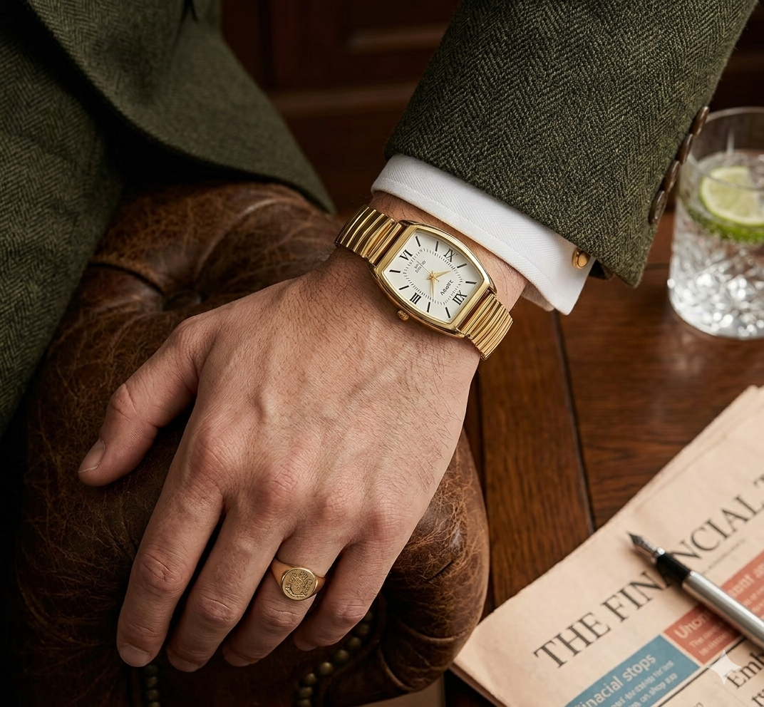 Timeless Radiance on Your Wrist -The Sovereign Aurora is more than a timepiece; it’s a statement of refined elegance. Featuring a stunning gold-tone expansion band and a delicate tonneau-shaped face, this watch captures the essence of vintage high-fashion.
